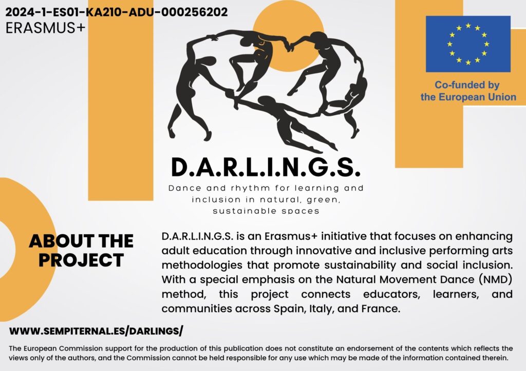 D.A.R.L.I.N.G.S. es un proyecto cofinanciado por la Unión Europea a través de ERASMUS +. El proyecto busca fomentar la inclusión social en adultos mediante la danza y sensibilizar sobre el cambio climático desde un enfoque artístico aplicado a la educación no formal para adultos.